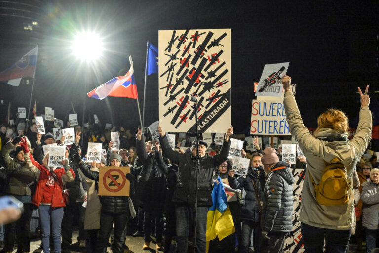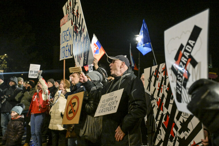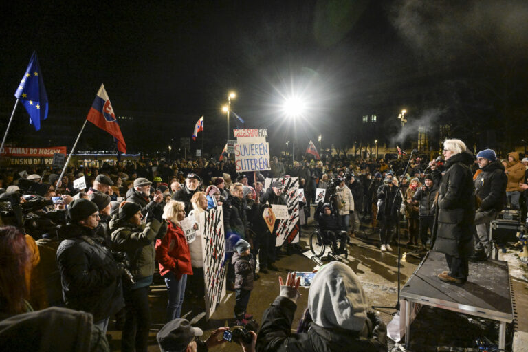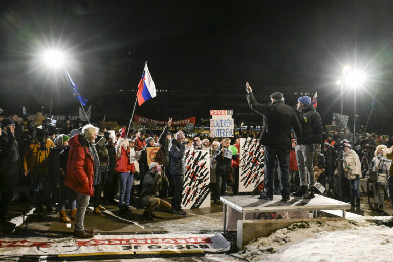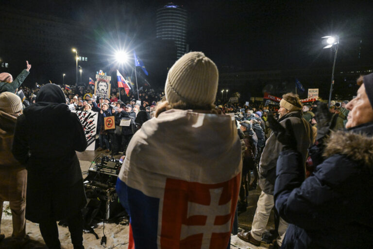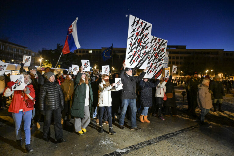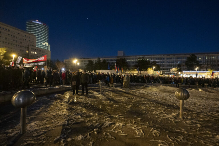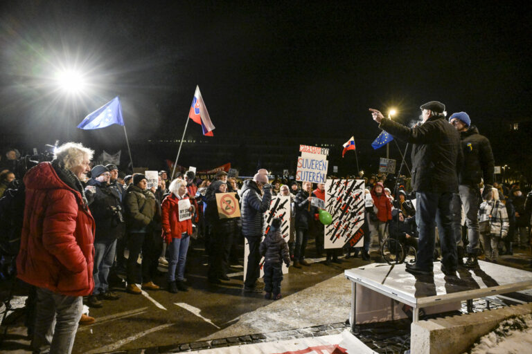 Atmosféra počas mobilizačného podujatia občianskeho združenia Mier Ukrajine s názvom Budíček Slovensko, okupácia začala, na Námestí slobody, pred Úradom vlády SR, ktorým sa začala séria zhromaždení a bude zároveň slúžiť ako pozvánka pre všetkých Slovákov a Slovenky na protest, ktorý sa uskutoční 10. januára 2025. Bratislava, 3. január 2025. Foto: SITA/Milan Illík