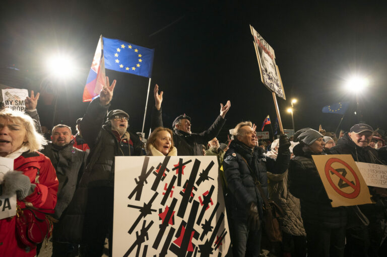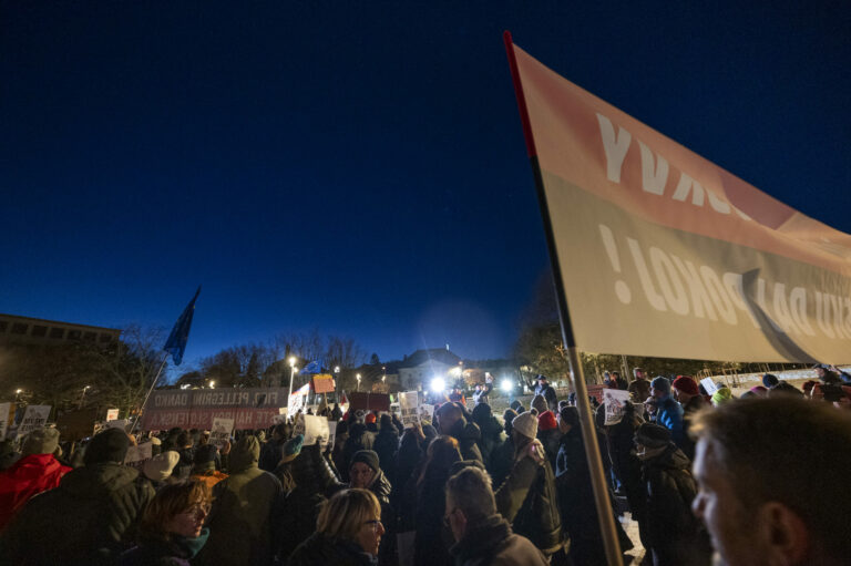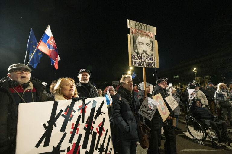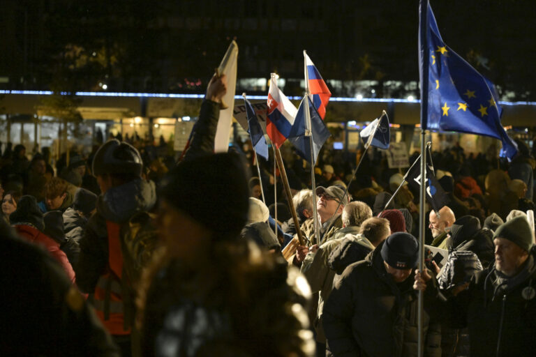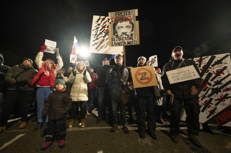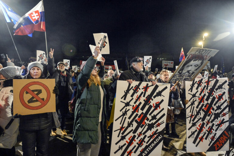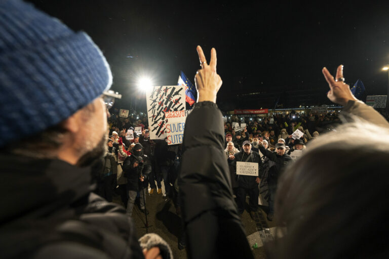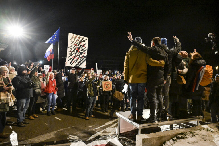 Atmosféra počas mobilizačného podujatia občianskeho združenia Mier Ukrajine s názvom Budíček Slovensko, okupácia začala, na Námestí slobody, pred Úradom vlády SR, ktorým sa začala séria zhromaždení a bude zároveň slúžiť ako pozvánka pre všetkých Slovákov a Slovenky na protest, ktorý sa uskutoční 10. januára 2025. Bratislava, 3. január 2025. Foto: SITA/Milan Illík