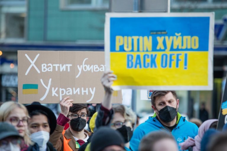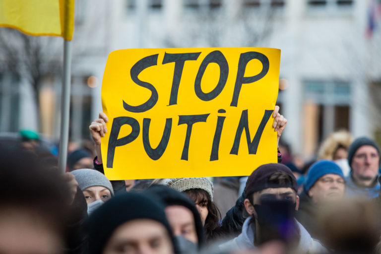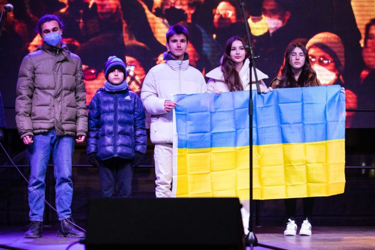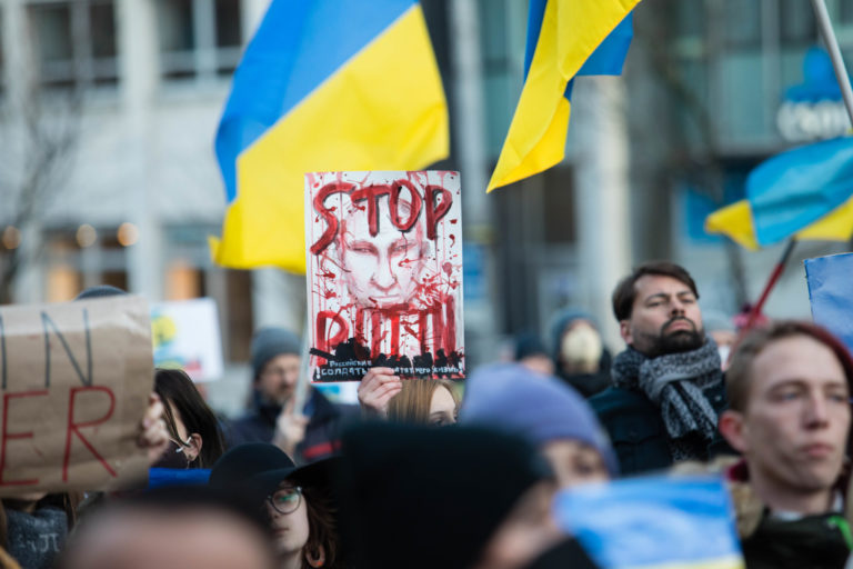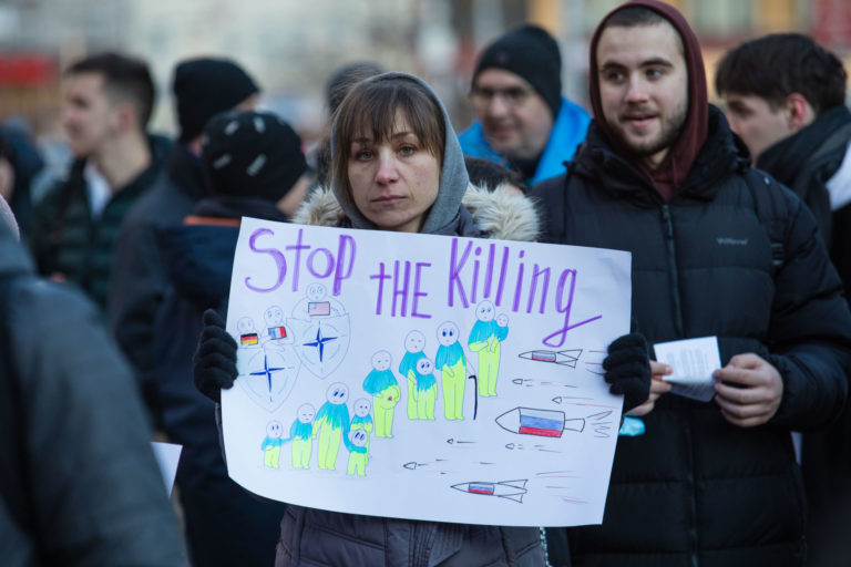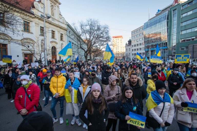 Účastníci protestného zhromaždenia Mier Ukrajine: Za vašu aj našu slobodu - Spolu zvíťazíme! na Námestí SNP v Bratislave. Bratislava, 11. marec 2022. Foto: SITA/Jana Birošová