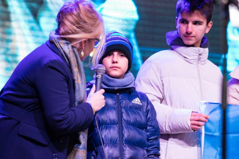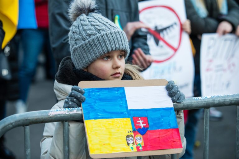 Jedenásťročný Hassan Alkhalaf (uprostred), ktorý niekoľko dní sám unikal z Ukrajiny za bratom Zakarijom študujúcim v SR počas protestného zhromaždenia Mier Ukrajine: Za vašu aj našu slobodu - Spolu zvíťazíme! na Námestí SNP v Bratislave. Bratislava, 11. marec 2022. Foto: SITA/Jana Birošová