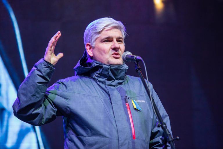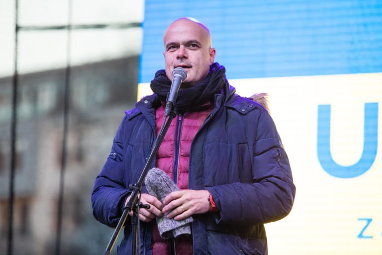 Producent Jaro Slávik počas protestného zhromaždenia Mier Ukrajine: Za vašu aj našu slobodu - Spolu zvíťazíme! na Námestí SNP v Bratislave. Bratislava, 11. marec 2022. Foto: SITA/Jana Birošová