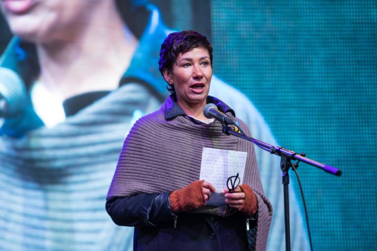Poslankyňa Európskeho parlamentu Lucia Nicholson počas protestného zhromaždenia Mier Ukrajine: Za vašu aj našu slobodu - Spolu zvíťazíme! na Námestí SNP v Bratislave. Bratislava, 11. marec 2022. Foto: SITA/Jana Birošová