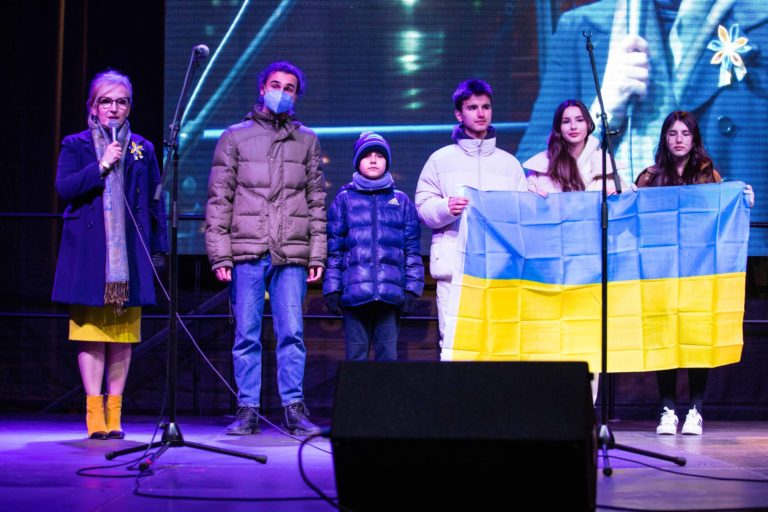 Účastníčka protestného zhromaždenia Mier Ukrajine: Za vašu aj našu slobodu - Spolu zvíťazíme! na Námestí SNP v Bratislave. Bratislava, 11. marec 2022. Foto: SITA/Jana Birošová