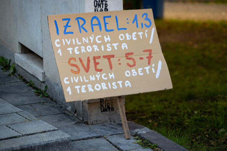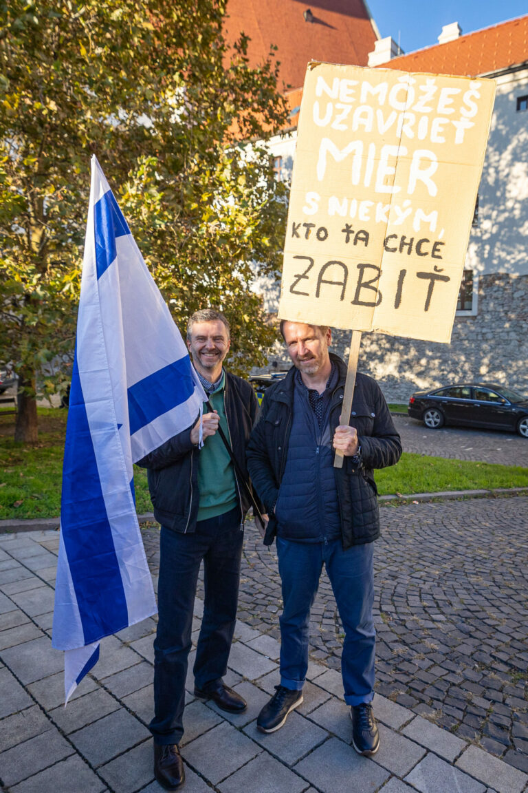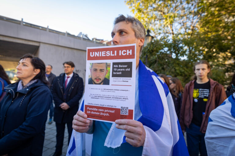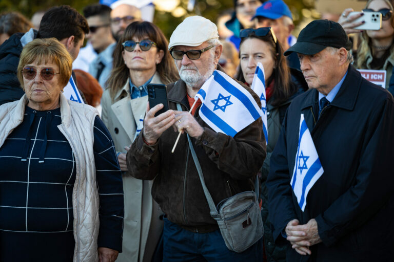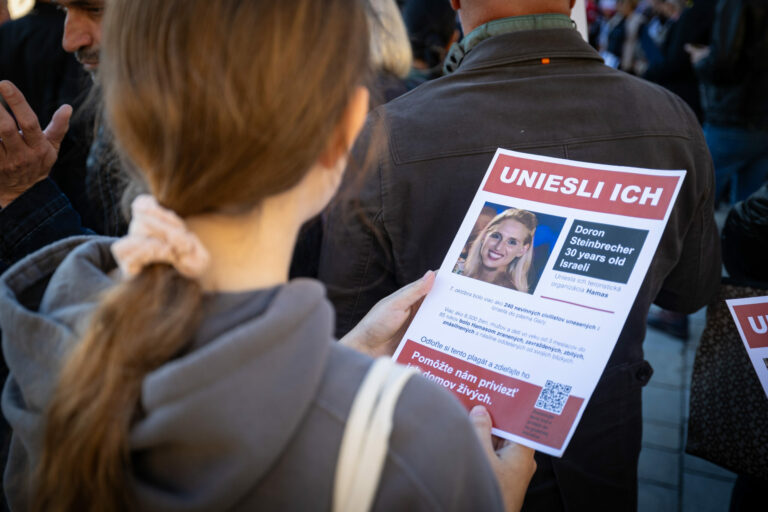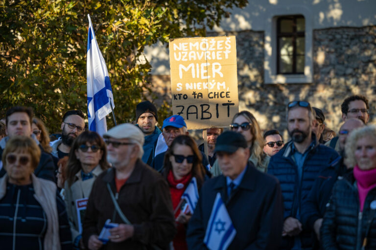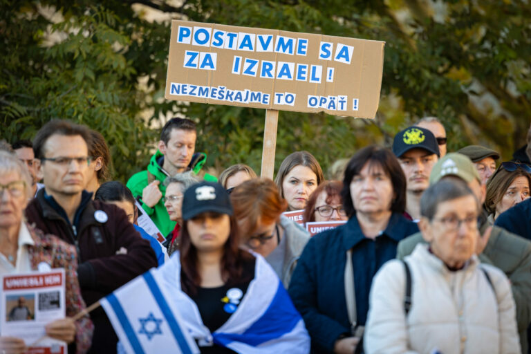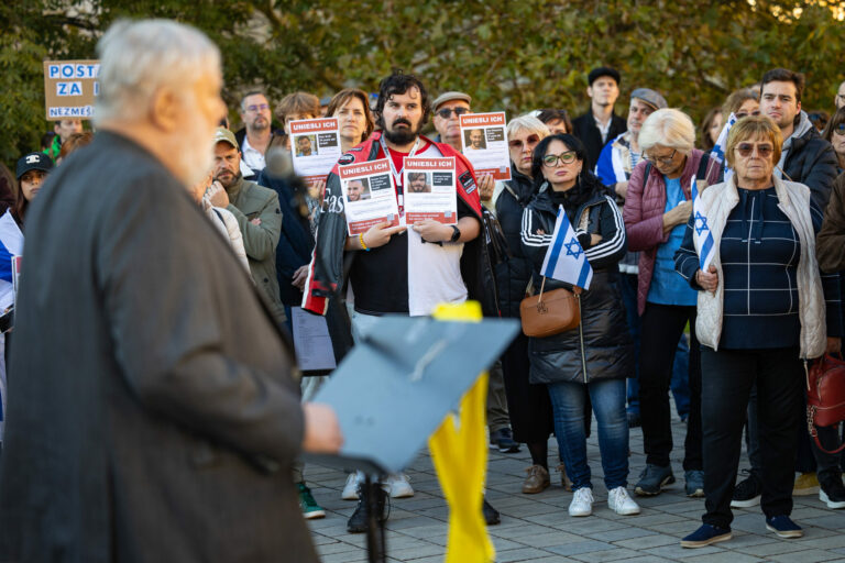 Atmosféra počas verejného zhromaždenia na podporu Izraela a pietnej pripomienky na masaker zo 7. októbra pri Pamätník holokaustu na Rybnom námestí v Bratislave. Bratislava, 7. október 2024. Foto: SITA/Jana Birošová
