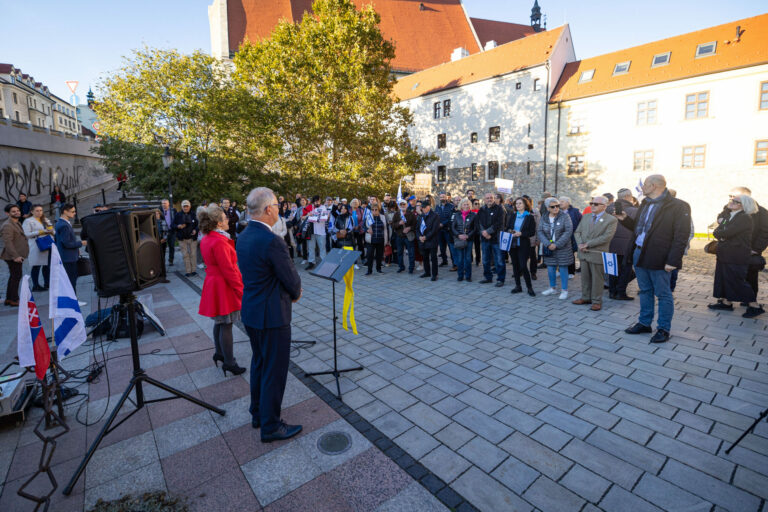 Účastníci počas verejného zhromaždenia na podporu Izraela a pietnej pripomienky na masaker zo 7. októbra pri Pamätník holokaustu na Rybnom námestí v Bratislave. Bratislava, 7. október 2024. Foto: SITA/Jana Birošová