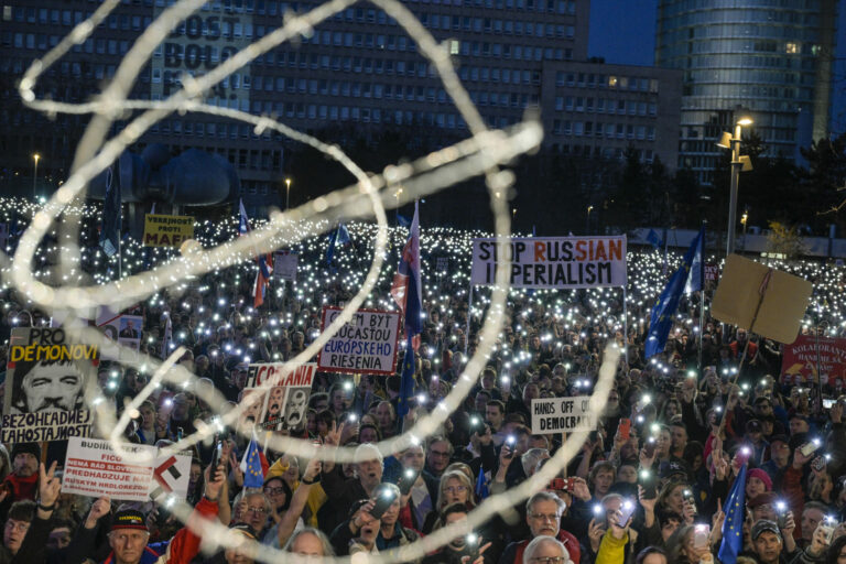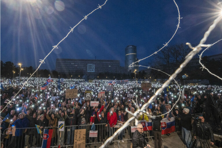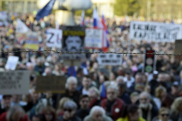 Plot z ostnatého drôtu počas protestného zhromaždenia Slovensko je Európa! organizovaného iniciatívou Mier Ukrajine na Námestí slobody v Bratislave. Bratislava, 7. marec 2025. Foto: SITA/Milan Illík