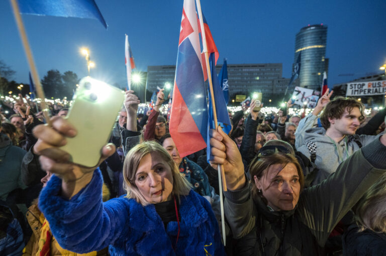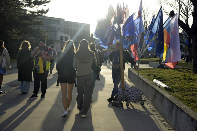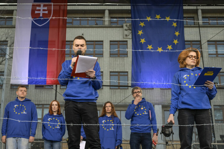 Atmosféra pred protestnéým zhromaždením Slovensko je Európa! organizovaného iniciatívou Mier Ukrajine na Námestí slobody v Bratislave. Bratislava, 7. marec 2025. Foto: SITA/Milan Illík