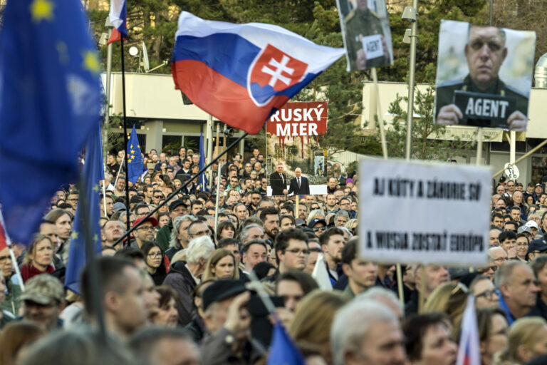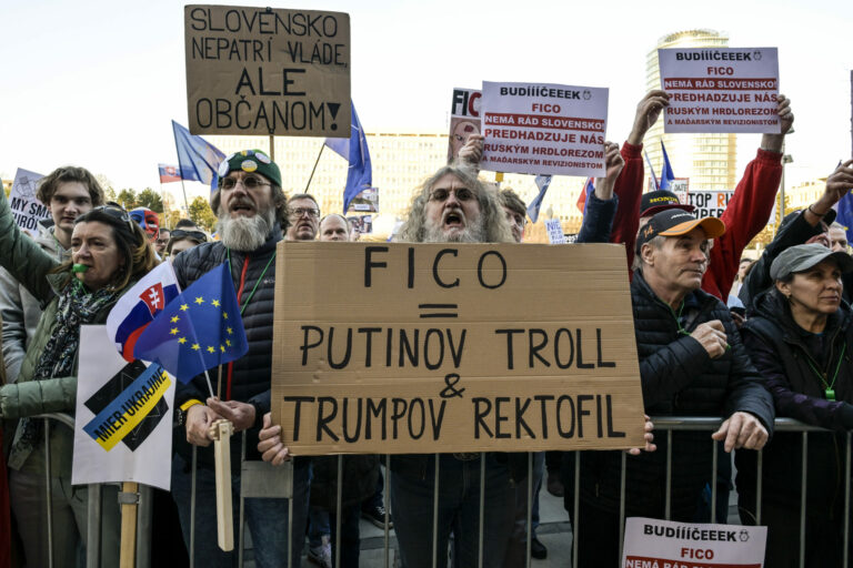 Aktivista z iniciatívy Mier Ukrajine Rastislav Kalinovič vľavo v popredí) a Marián Kulich z iniciatívy Mier Ukrajine (druhý sprava) počas protestného zhromaždenia Slovensko je Európa! organizovaného iniciatívou Mier Ukrajine na Námestí slobody v Bratislave. Bratislava, 7. marec 2025. Foto: SITA/Milan Illík