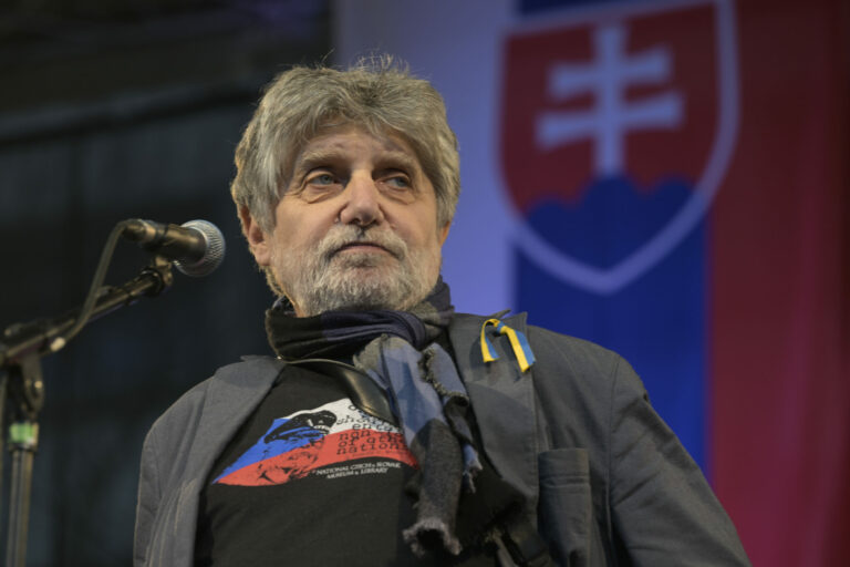 Český herec, scenárista, režisér Břetislav Rychlík počas protestného zhromaždenia Slovensko je Európa! organizovaného iniciatívou Mier Ukrajine na Námestí slobody v Bratislave. Bratislava, 7. marec 2025. Foto: SITA/Milan Illík