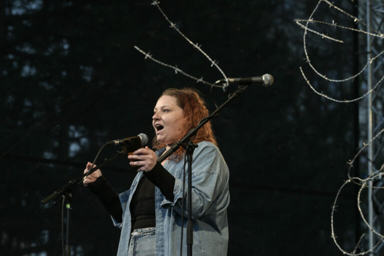 Slamerka Veroni Gyenge počas protestného zhromaždenia Slovensko je Európa! organizovaného iniciatívou Mier Ukrajine na Námestí slobody v Bratislave. Bratislava, 7. marec 2025. Foto: SITA/Milan Illík