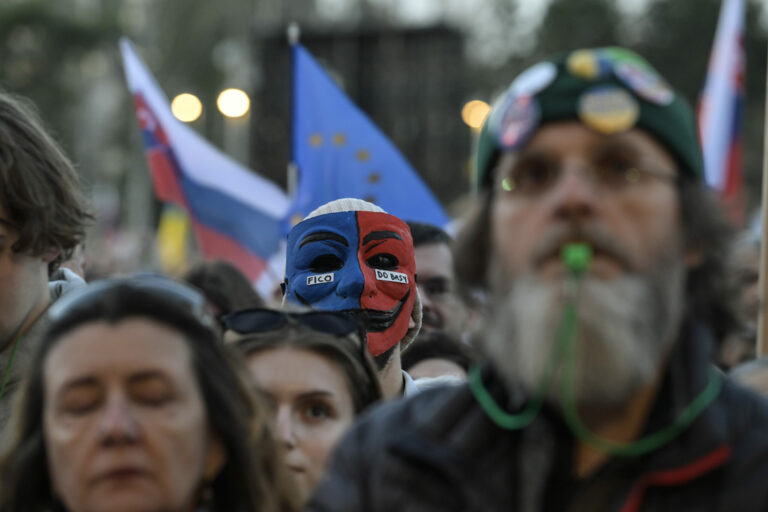 Účastníci počas protestného zhromaždenia Slovensko je Európa! organizovaného iniciatívou Mier Ukrajine na Námestí slobody v Bratislave. Bratislava, 7. marec 2025. Foto: SITA/Milan Illík