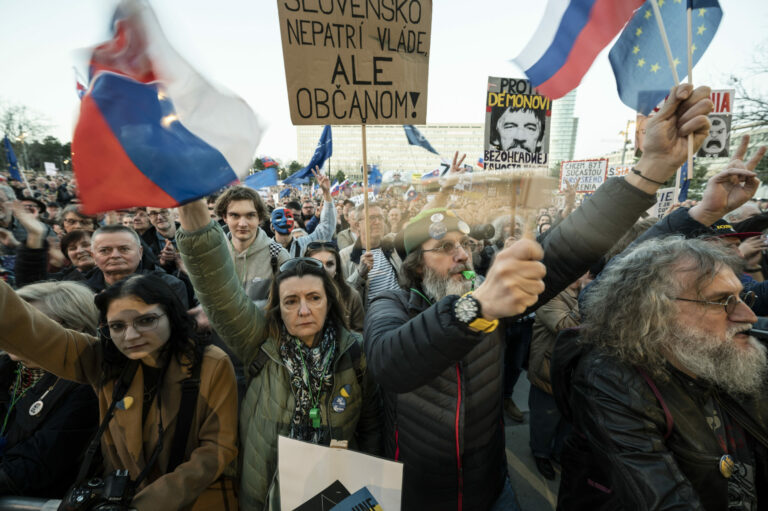 Účastníci s transparentmi a vlajkami počas protestného zhromaždenia Slovensko je Európa! organizovaného iniciatívou Mier Ukrajine na Námestí slobody v Bratislave. Bratislava, 7. marec 2025. Foto: SITA/Milan Illík
