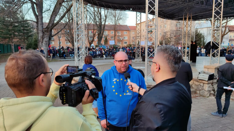 Podnikateľ a občiansky aktivista Michal Jamrich (uprostred v popredí) počas protestného zhromaždenia Slovensko je Európa! v parku Jozefa Miloslava Hurbana v Novom Meste nad Váhom. Nové Mesto nad Váhom, 7. marec 2025. Foto: SITA/Tomáš Urminský