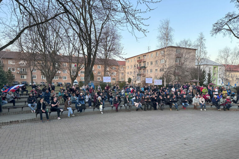 Účastníci počas protestného zhromaždenia Slovensko je Európa! v parku Jozefa Miloslava Hurbana v Novom Meste nad Váhom. Nové Mesto nad Váhom, 7. marec 2025. Foto: SITA/Michal Jamrich