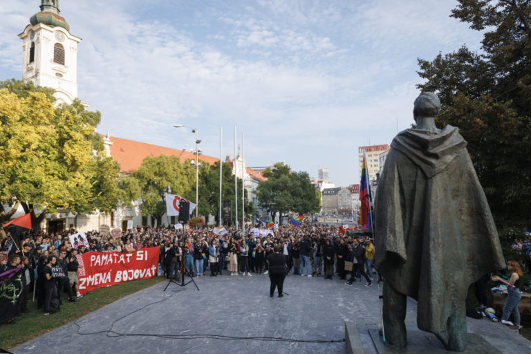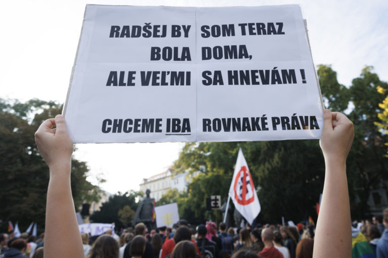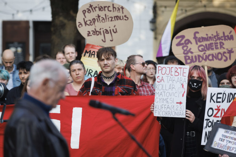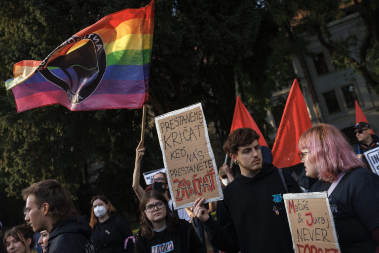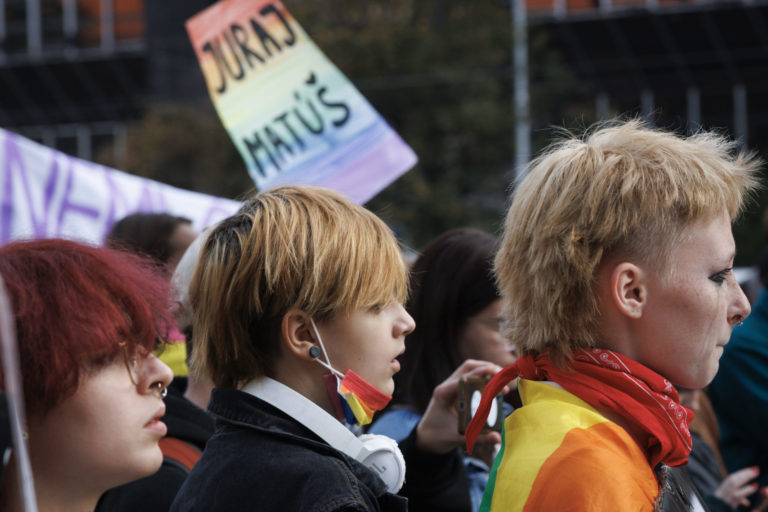 Transparent počas zhromaždenia Zostávame v uliciach na vyjadrenie podpory queer komunite po stredajšej vražde dvoch mladých ľudí, Juraja a Matúša, na Námestí SNP. Bratislava, 16. október 2022. Foto: SITA/Branislav Bibel.