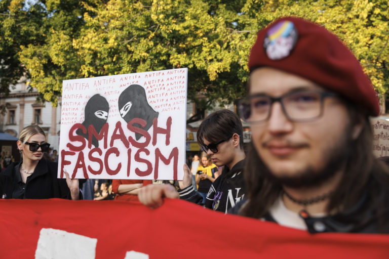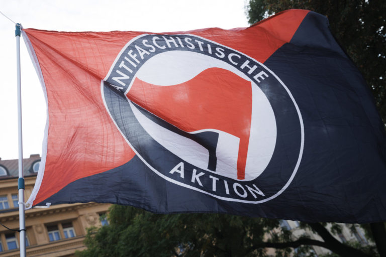 Vlajka Antify počas zhromaždenia Zostávame v uliciach na vyjadrenie podpory queer komunite po stredajšej vražde dvoch mladých ľudí, Juraja a Matúša, na Námestí SNP. Bratislava, 16. október 2022. Foto: SITA/Branislav Bibel.