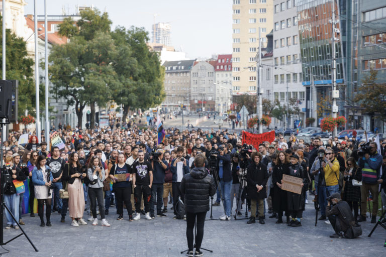 Účastníci počas zhromaždenia Zostávame v uliciach na vyjadrenie podpory queer komunite po stredajšej vražde dvoch mladých ľudí, Juraja a Matúša, na Námestí SNP. Bratislava, 16. október 2022. Foto: SITA/Branislav Bibel.
