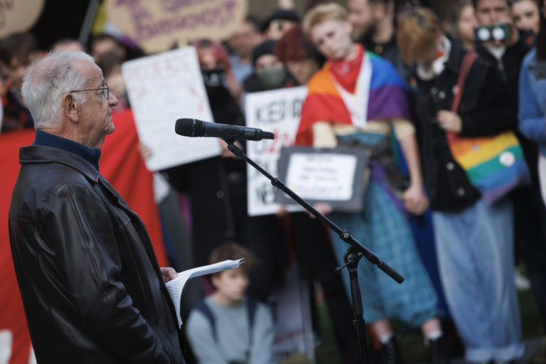 Historik Ivan Kamenec počas zhromaždenia Zostávame v uliciach na vyjadrenie podpory queer komunite po stredajšej vražde dvoch mladých ľudí, Juraja a Matúša, na Námestí SNP. Bratislava, 16. október 2022. Foto: SITA/Branislav Bibel.
