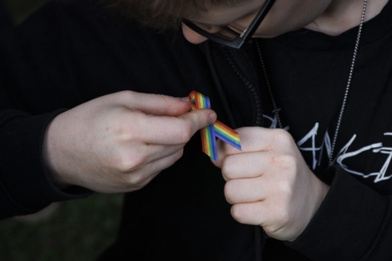 Účastník si pripína dúhovú stužku počas zhromaždenia Zostávame v uliciach na vyjadrenie podpory queer komunite po stredajšej vražde dvoch mladých ľudí, Juraja a Matúša, na Námestí SNP. Bratislava, 16. október 2022. Foto: SITA/Branislav Bibel.