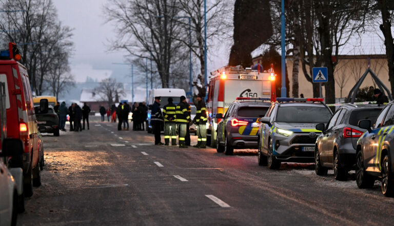 Záchranné zložky a policajné autá na ceste vedúcej ku Gymnáziu v Spišskej Starej Vsi v okrese Kežmarok, po útoku žiaka nožom, kde zahynuli dve ženy a tretia žena utrpela stretne ťažké poranenia. Spišská Stará Ves, 16. január 2025. Foto: SITA/Viktor Zamborský.