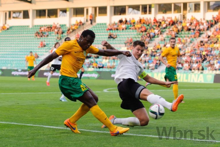 Zľava: Lukáš Čmelík (MŠK Žilina) a Abdoul-Gafar Mamah (FC Dacia Kišiňov) počas zápasu medzi MŠK Žilina - FC Dacia Kišiňov. Žilina, 23. júl 2015. Foto: SITA/Milo Fabian