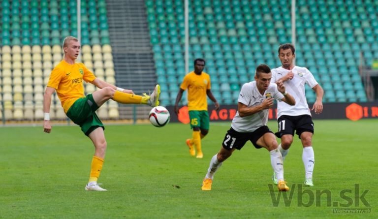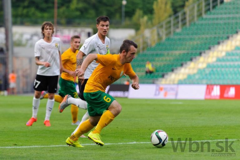 Zľava: Veaceslav Posmac (FC Dacia Kišiňov) a Jaroslav Mihalík (MŠK Žilina) počas zápasu medzi MŠK Žilina - FC Dacia Kišiňov. Žilina, 23. júl 2015. Foto: SITA/Milo Fabian