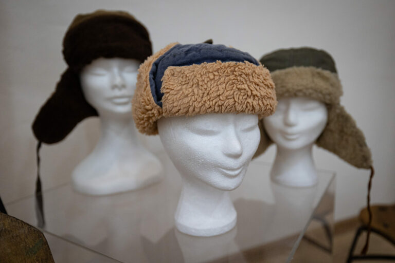 Historické čiapky, takzvané ušianky, počas výstavy Zima na saniach v Kysuckom múzeu v Čadci. Čadca, 16. december 2024. Foto: SITA/Jana Birošová