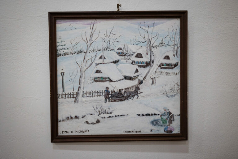 Obraz od kysuckej insitnej maliarky Ireny Zemaníkovej s názvom Zima u Michnáča počas výstavy Zima na saniach v Kysuckom múzeu v Čadci. Čadca, 16. december 2024. Foto: SITA/Jana Birošová