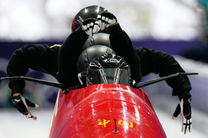 China's Kaizhi Sun, front, starts for a four man bobsled training session at the 2026 Winter Olympics, in Cortina d'Ampezzo, Italy, Friday, Feb. 20, 2026. Foto: SITA/AP