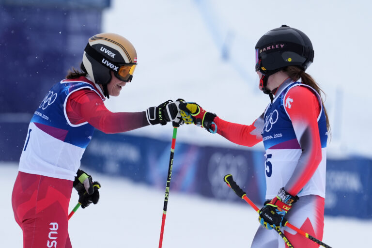 Austria's Katrin Ofner (1), left, and Canada's Brittany Phelan (5) fist bump before the women's ski cross qualifications at the 2026 Winter Olympics, in Livigno, Italy, Friday, Feb. 20, 2026. Foto: SITA/AP