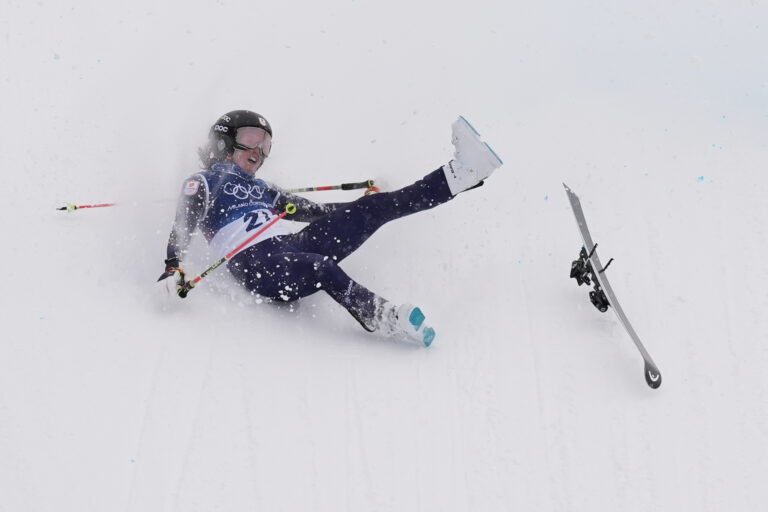 Japan's Makiko Arai (27) crashes during the women's ski cross qualifications at the 2026 Winter Olympics, in Livigno, Italy, Friday, Feb. 20, 2026. Foto: SITA/AP