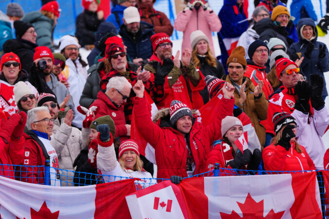 Canada fans reacts during the men's freestyle skiing halfpipe qualifications at the 2026 Winter Olympics, in Livigno, Italy, Friday, Feb. 20, 2026. Foto: SITA/AP