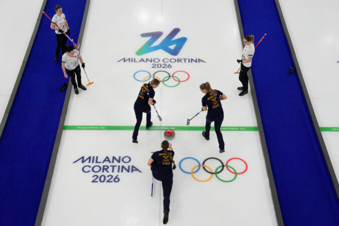 Sweden's Sofia Scharback, Agnes Knochenhauer and Sara McManus compete during a women's curling round robin match against Switzerland at the 2026 Winter Olympics, in Cortina d'Ampezzo, Italy, Monday, Feb. 16, 2026. Foto: SITA/AP
