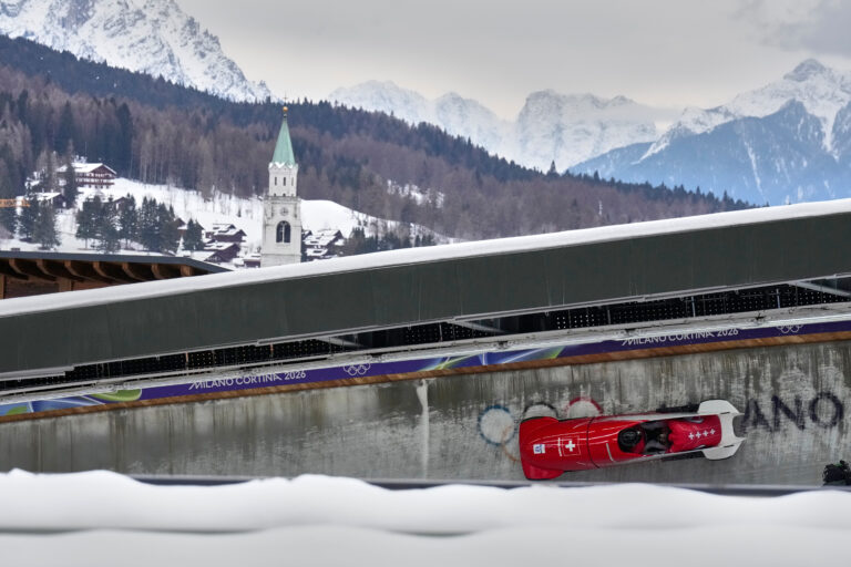 Switzerland's Cedric Follador, front, and Luca Rolli slide down the track during a two man bobsled run at the 2026 Winter Olympics, in Cortina d'Ampezzo, Italy, Monday, Feb. 16, 2026. Foto: SITA/AP