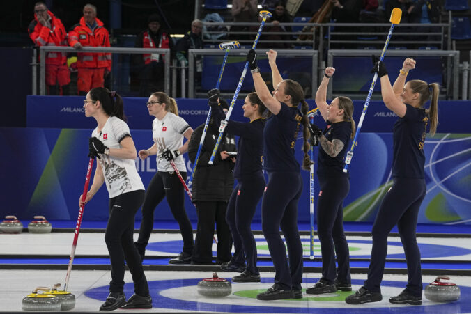 Sweden's Anna Hasselborg, Sara McManus, Sofia Scharback, and Agnes Knochenhauer react while competing against Switzerland's Alina Paetz and Carole Howald after the women's curling round robin session at the 2026 Winter Olympics, in Cortina d'Ampezzo, Italy, Monday, Feb.16, 2026. Foto: SITA/AP