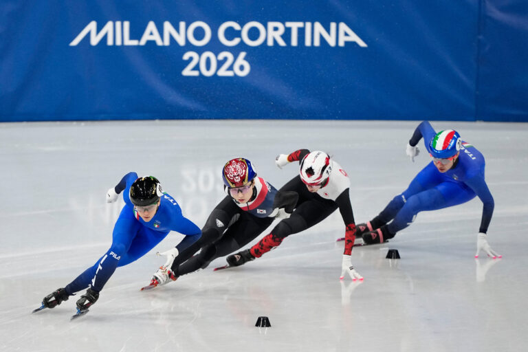 Arianna Fontana, left, of Italy leads her heat during the women's 1000 meter short track speed skating at the 2026 Winter Olympics, in Milan, Italy, Monday, Feb. 16, 2026. Foto: SITA/AP