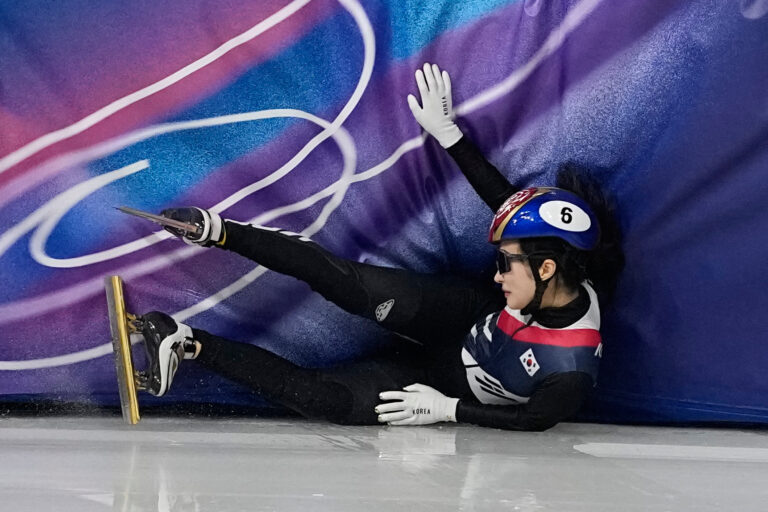 Kim Gilli of South Korea crashes during the women's 1000 meter short track speed skating at the 2026 Winter Olympics, in Milan, Italy, Monday, Feb. 16, 2026. Foto: SITA/AP