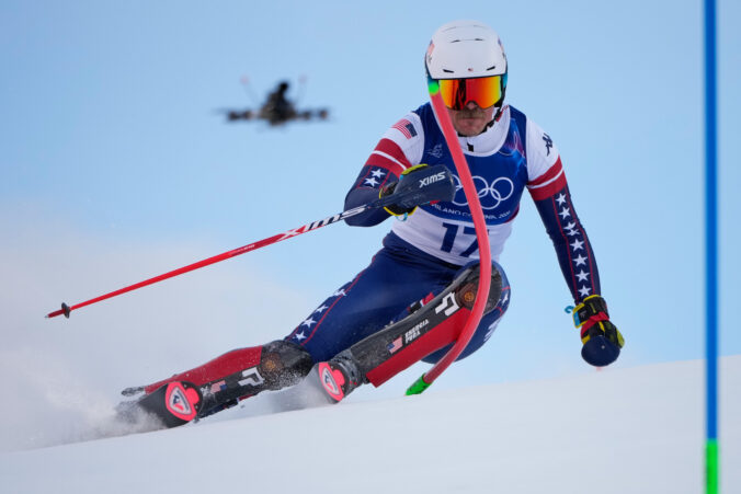 United States' River Radamus speeds down the course of an alpine ski men's slalom portion of a team combined race, at the 2026 Winter Olympics, in Bormio, Italy, Monday, Feb. 9, 2026. Foto: SITA/AP.