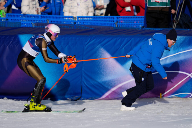 Finland's Eduard Hallberg, left, is pulled by his teammate Finland's Elian Lehto at the finish area of an alpine ski men's slalom portion of a team combined race, at the 2026 Winter Olympics, in Bormio, Italy, Monday, Feb. 9, 2026. Foto: SITA/AP.