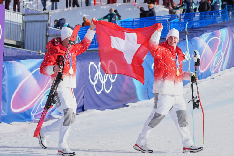 Switzerland's Franjo von Allmen, right, and teammate Switzerland's Tanguy Nef wave the Swiss flag as they celebrate winning the gold medal in an alpine ski men's team combined race, at the 2026 Winter Olympics, in Bormio, Italy, Monday, Feb. 9, 2026. Foto: SITA/AP.