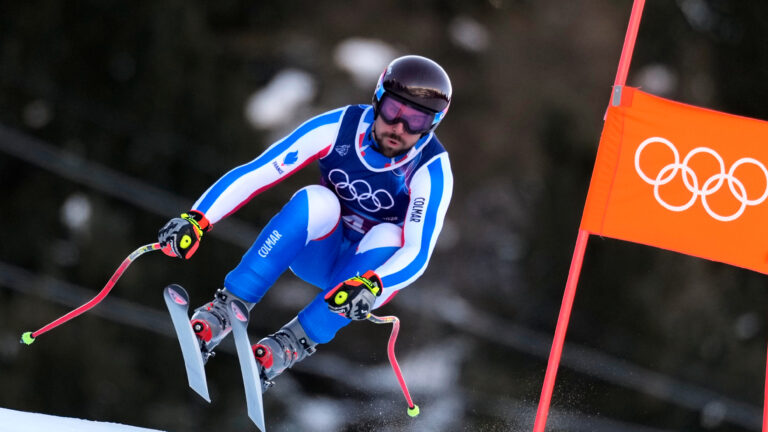 France's Maxence Muzaton speeds down the course during an alpine ski men's downhill portion of a team combined race, at the 2026 Winter Olympics, in Bormio, Italy, Monday, Feb. 9, 2026. Foto: SITA/AP.