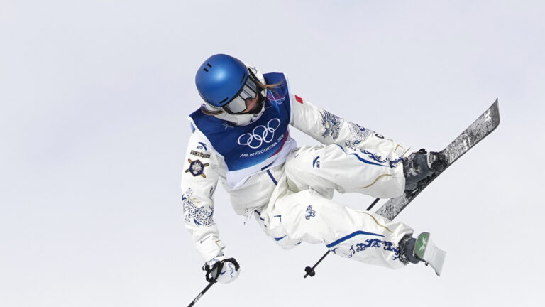 China's Eileen Gu competes during the women's freestyle skiing slopestyle finals at the 2026 Winter Olympics, in Livigno, Italy, Monday, Feb. 9, 2026. Foto: SITA/AP.