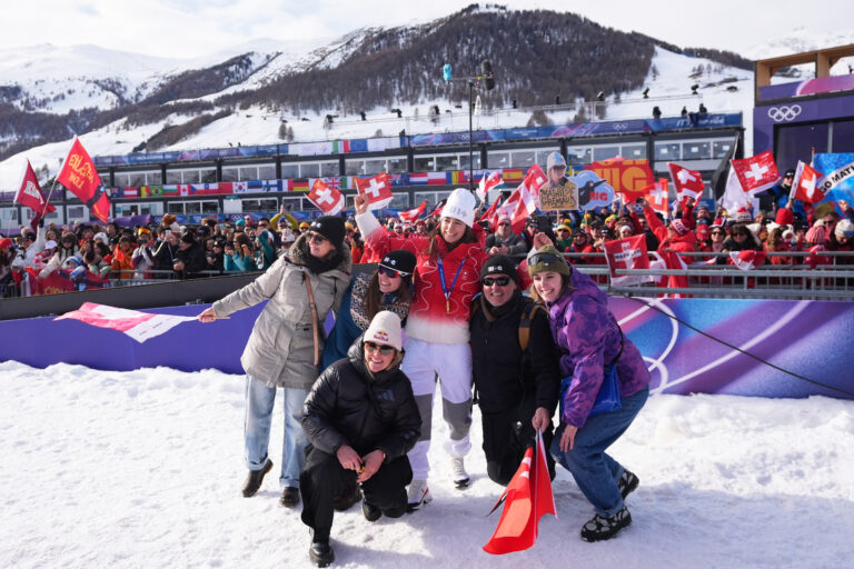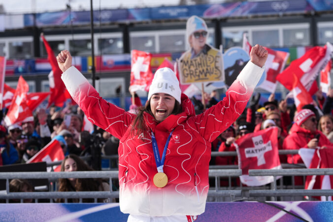 Gold medalist Switzerland's Mathilde Gremaud celebrates after the women's freestyle skiing slopestyle finals at the 2026 Winter Olympics, in Livigno, Italy, Monday, Feb. 9, 2026. Foto: SITA/AP.