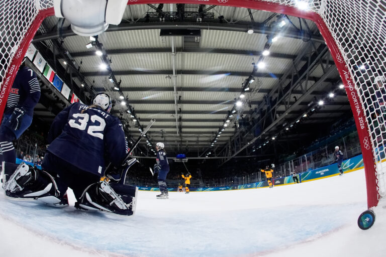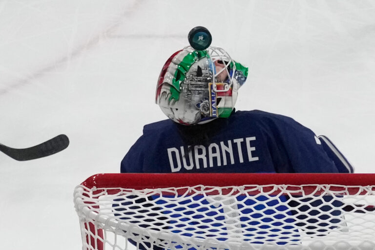 Italy's goalkeeper Gabriella Durante fails to save the puck as Japan's Akane Shiga scores her side's second goal during a preliminary round match of women's ice hockey between Japan and Italy at the 2026 Winter Olympics, in Milan, Italy, Monday, Feb. 9, 2026. Foto: SITA/AP.