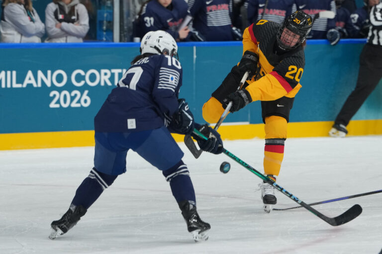 Germany's Daria Gleissner (20) takes a shot past France's Sophie Leclerc (10) in the first period during a preliminary round match of women's ice hockey at the 2026 Winter Olympics, in Milan, Italy, Monday, Feb. 9, 2026. Foto: SITA/AP.
