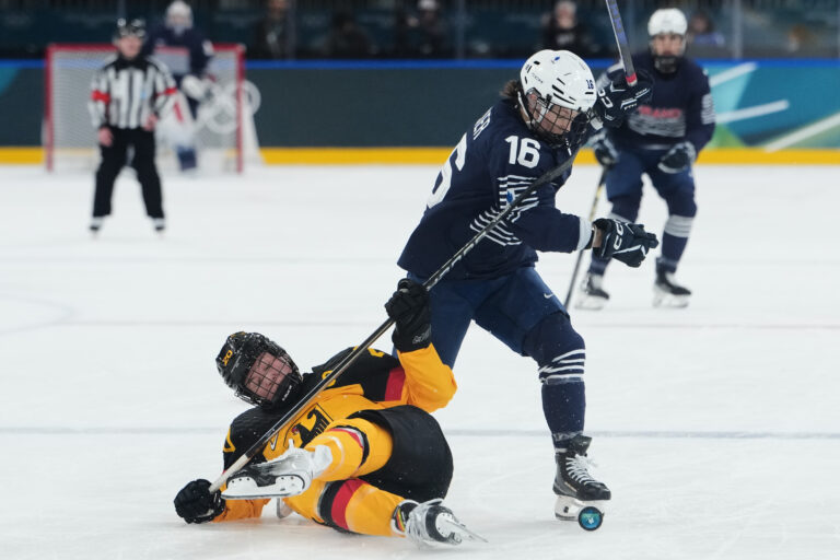 France's Alice Philbert, left, saves in front of Germany's Jule Schiefer during a preliminary round match of women's ice hockey between Germany and France at the 2026 Winter Olympics, in Milan, Italy, Monday, Feb. 9, 2026. Foto: SITA/AP.