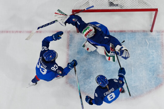 Italy players celebrate end of a preliminary round match of women's ice hockey between Japan and Italy at the 2026 Winter Olympics, in Milan, Italy, Monday, Feb. 9, 2026. Foto: SITA/AP.