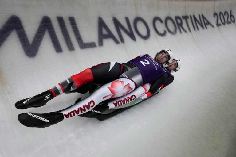 Canada's Devin Wardrope and Cole Zajanski, right, slide down the track during a men's doubles luge training session at the 2026 Winter Olympics, in Cortina d'Ampezzo, Italy, Monday, Feb. 9, 2026. Foto: SITA/AP