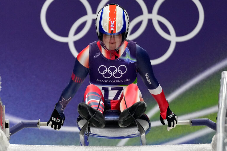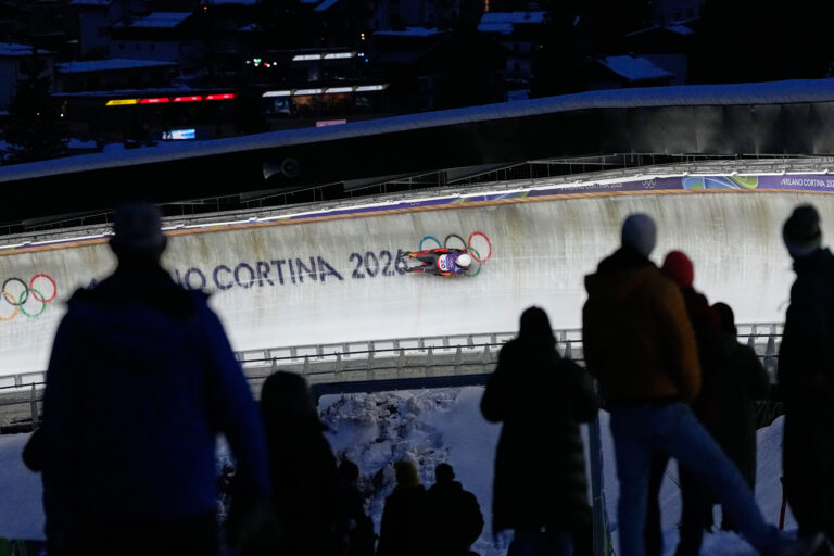 United States' Emily Fischnaller starts for a women's single luge run at the 2026 Winter Olympics, in Cortina d'Ampezzo, Italy, Monday, Feb. 9, 2026. Foto: SITA/AP.