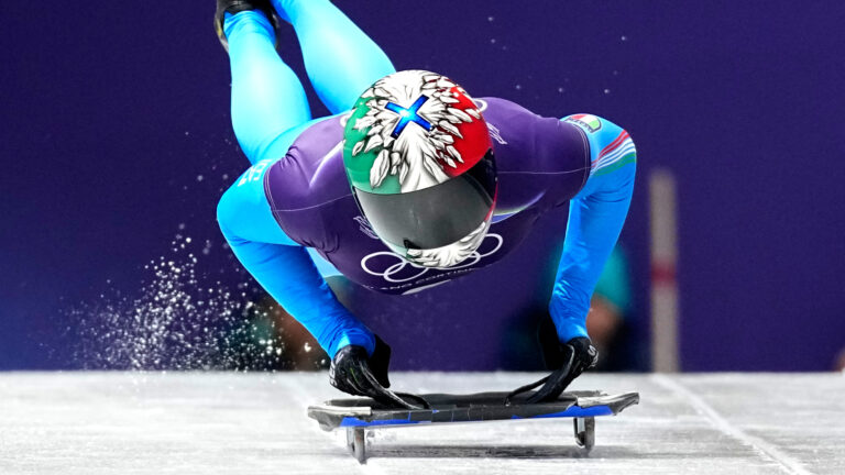 Italy's Amedeo Bagnis starts for a men's skeleton training session at the 2026 Winter Olympics, in Cortina d'Ampezzo, Italy, Monday, Feb. 9, 2026. Foto: SITA/AP.